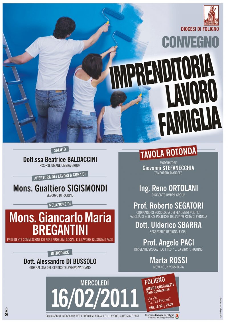 Mercoledì 16 febbraio 2011, dalle ore 16.30 alle 20, presso la Sala conferenze dell’Azienda Umbra Cuscinetti S.p.A. (zona industriale Paciana), la Diocesi di Foligno promuove un convegno su ‘Imprenditoria, Lavoro, Famiglia’. Di fronte a quali scenari ci troviamo, nei rapporti tra aziende e lavoratori? Il lavoro ha ancora una sua dimensione soggettiva, che mette al centro la persona umana?