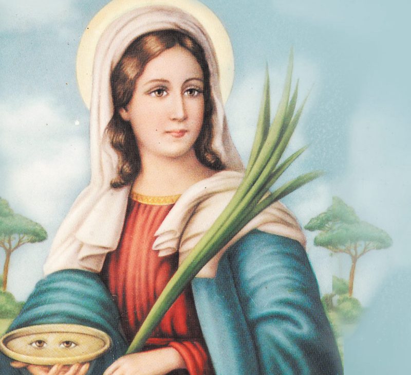 Santa Lucia fu una delle vittime della persecuzione di Diocleziano e Massimiano, che durò dal 303 al 311. Secondo la tradizione, quando era già promessa sposa ad un giovane del suo rango (lei era una nobile siracusana), essendosi ammalata la madre, Lucia la accompagnò a Catania in pellegrinaggio sulla tomba di sant’Agata: qui ebbe una visione che le annunciava la guarigione della madre insieme al futuro martirio. Tornata a Siracusa, decise di consacrarsi al Signore e mise in vendita la sua dote per donarne il ricavato ai poveri. Il fidanzato, sconvolto per l’abbandono, la denunciò come cristiana al governatore Pascasio, che la fece arrestare imponendole di sacrificare agli dei. Al fermo rifiuto di Lucia, Pascasio la condannò al lupanare, la casa delle prostitute, ma quando i soldati tentarono di condurvela, lo Spirito Santo la rese così immobile che nessuno riusciva a spostarla, neppure con una coppia di buoi ai quali venne agganciata. Allora il governatore ordinò un gran fuoco di fascine per incenerirla, ma la giovane uscì indenne dal rogo. Non restava che la decapitazione, tuttavia secondo un’altra tradizione non le fu tagliata la testa, ma fu pugnalata alla gola (infatti, la statua della santa che viene portata in processione a Siracusa ha un pugnale piantato nel collo). Era il 13 dicembre del 304, Lucia aveva probabilmente 25 anni. Le sue spoglie mortali si venerano a Venezia nella chiesa dei santi Geremia e Lucia. Prima si trovavano in Sicilia, ma ai tempi della conquista musulmana furono nascoste in luogo sicuro finché nel 1039 il generale bizantino Maniace decise di trasportarle a Costantinopoli per donarle alla regina Teodora. Quando, nel 1204, Costantinopoli fu conquistata dai Crociati, il doge Enrico Dandolo le portò a Venezia. Poi, attraverso missioni diplomatiche, Siracusa ottenne dai veneziani alcune reliquie della martire. La più recente è stata consegnata il 13 dicembre 1988 alla Chiesa siracusana dal cardinale Cè.