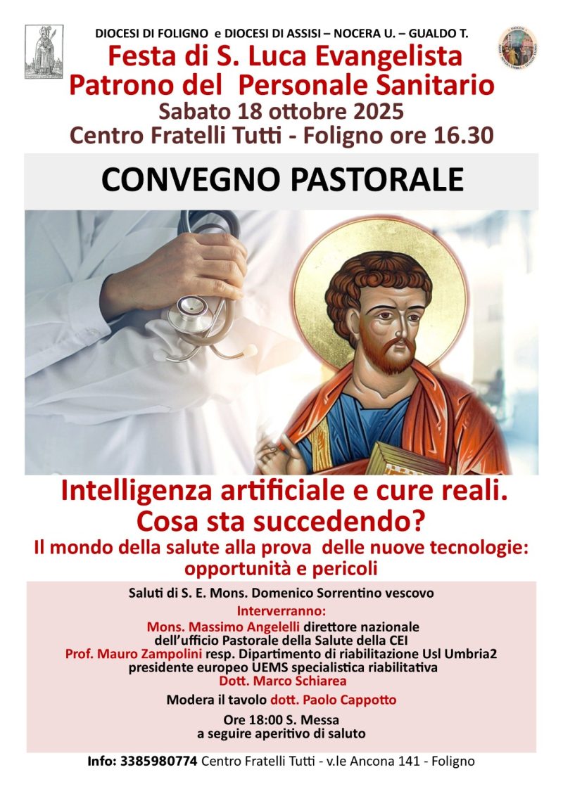 Sabato 18 aprile alle ore 16.30, presso il Centro Fratelli Tutti, gli Uffici diocesani per la salute delle due Chiese sorelle di Foligno e di Assisi – Nocera Umbra – Gualdo Tadino propongono un convegno pastorale nell’ambito della Festa liturgica di San Luca Patrono del personale sanitario.