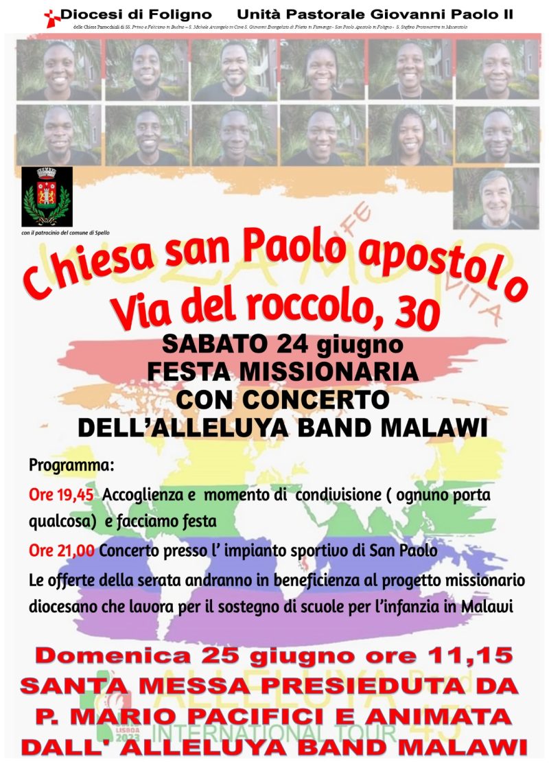 Presso la Chiesa San Paolo Apostolo, via del Roccolo n° 30 in Foligno. L’Alleluya Band è gruppo di assoluto rilievo nel panorama musicale del Malawi che promuove, anche attraverso il tour in Italia, la cultura tradizionale attraverso canti e danze delle tribù precoloniali.