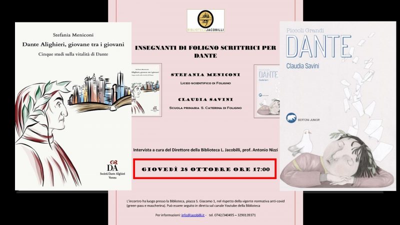 Il direttore della Biblioteca Jacobilli, Antonio NIZZI, intervista le autrici di due opere su Dante. Stefania MENICONI (Liceo Scientifico di Foligno), “Dante Alighieri, giovane tra i giovani. Cinque studi sulla vitalità di Dante”, Gingko Edizioni 2020. Claudia SAVINI (Scuola Primaria S. Caterina di Foligno), “Piccoli Grandi. Dante”, Bertoni Junior 2021.